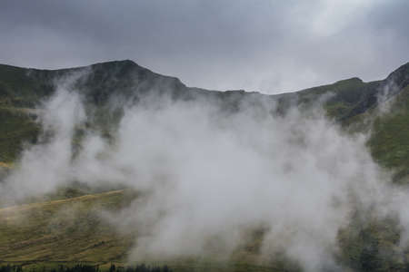 Magical overcast landscape of the Montenegrin ridge in the Carpathians, picturesque landscapes from Gutin Tomnatych, the Carpathians after the summer morning rain. 2020