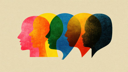 Silhouette of human faces in layered, colorful abstract shapes illustrating diversity and inclusion. Artistic representation of equity, multiracial unity, and cultural belonging.