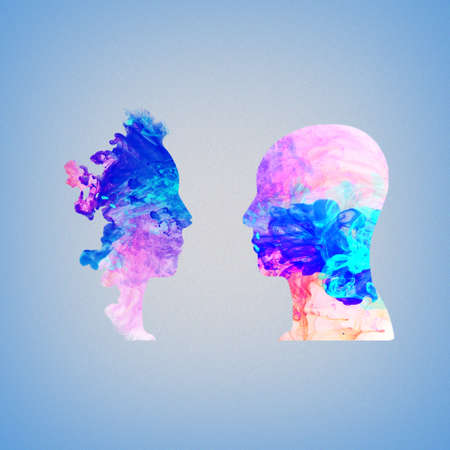 Artistic representation of two human silhouettes facing each other with vibrant color overlays, symbolizing connection and duality.
