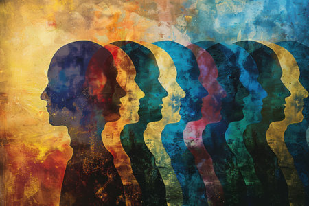This artwork presents a series of overlapping silhouette heads in a spectrum of vibrant colors. The composition utilizes a simple yet impactful design, with a focus on form and color. The piece uses soft textures and lighting to create a visually engaging experience. This image could be used for conceptual projects, editorial illustrations, or design purposes.
