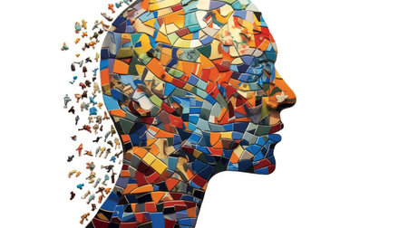 Abstract human head made of unsolved puzzle pieces, maximalism, psychology, brain, neurosis, compulsive. Generative AI image weber.