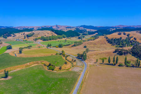 Rural country road winding its way through agriculture and farm land in the heartland of the South Island NZ