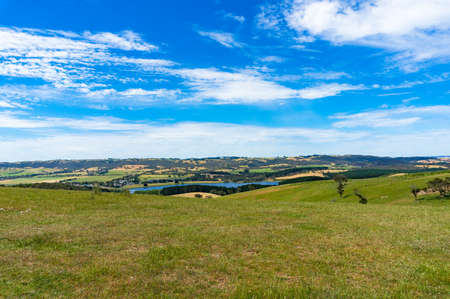 Panoramic landscape of countryside field with dam, lake on sunny day. Myponga, South Australia