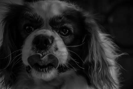 The dog of the Belgian griffon, lying on the lawn with a close look