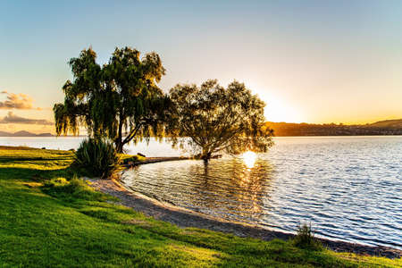 Magnificent sunset. Taupo is the largest lake in New Zealand, North Island. The most popular holiday destinations for tourists. Quiet evening on the lake.