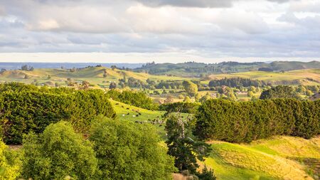 Retro style photo of New Zealand Landscape with green rolling hills and distant mountain range under cloudy sky. Greys Hill Lookout, Gisborne, North Island, New Zealand.