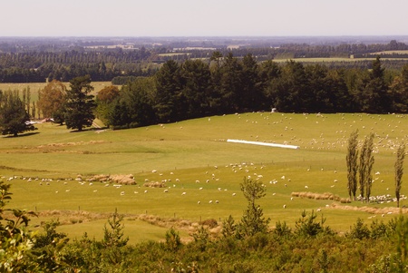 Mob of sheep grazing on a Canterbury farm, South Island, New Zealand