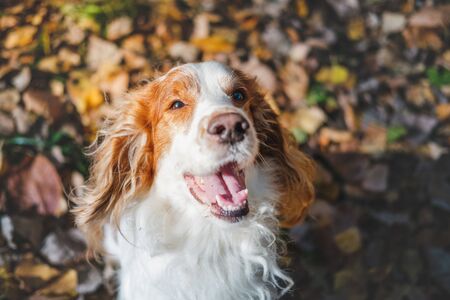 Portrait of a friendly purebred russian spaniel. Cute spaniel dog sits among autumn leaves in grass at a park