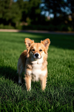 happy fluffy white and brown dog runs towards the camera on green lawn on sunny day.