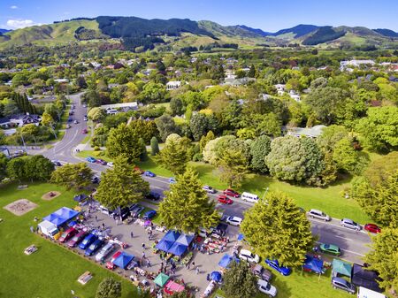 An aerial of The Waikanae sunday market at Park Rd showing the carpark and stalls set up in the park