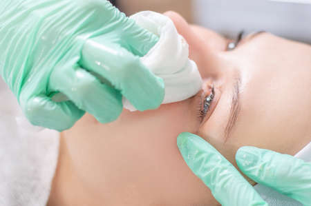 beautiful young woman enjoys a beautician at the reception. Beautician cleanses the face and makes anti-aging and facial wrinkles care. Cosmetology concept. The cosmetologist performs the procedure to cleanse the face with problem skin.