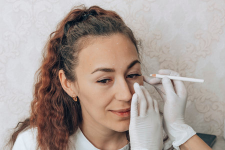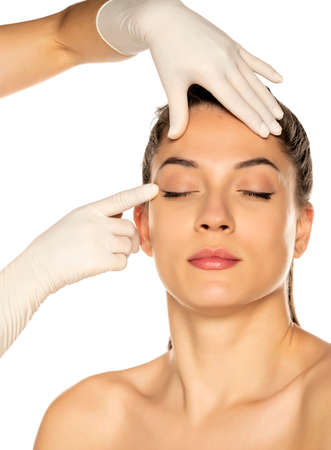 Doctor applies markings on the skin of the young woman patient's before the plastic surgery to correct the eyebrows