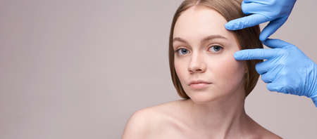 Young pretty woman studio portrait. Cosmetology concept. Esthetic woman face. Skin care dermatology beauty contour. Harmony girl. For cream, lotion horizontal banner. Copyspace