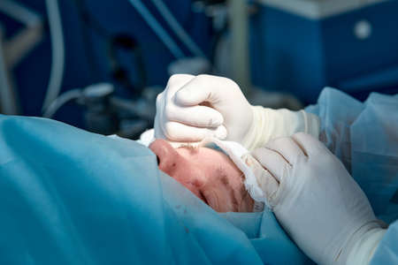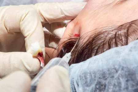 Woman patient is lying on the operating table. Doctor wearing medical gloves is cutting the skin above her eyebrow with a scalpel
