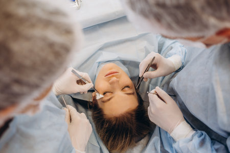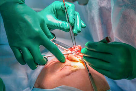 Rhinoplasty close-up. A real operation, a team of surgeons performs an operation on the nose. Modern medicine, health.