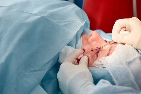 Close up of the face of a patient who is undergoing blepharoplasty. The surgeon cuts the eyelid and performs manipulations using medical instruments