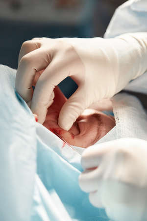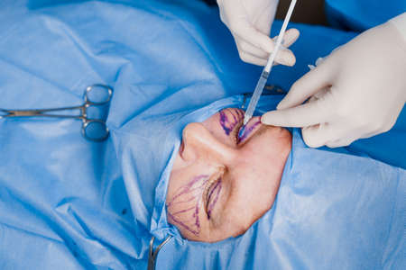 Close-up anesthesia before blepharoplasty and lipofilling plastic surgery operation for modifying the eye region of the face in medical clinic. Surgeon sutures the eyelid