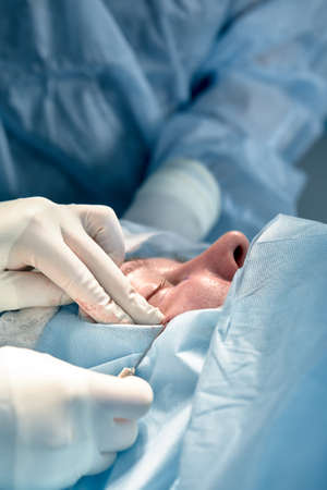 Close up of the face of a patient who is undergoing blepharoplasty. The surgeon cuts the eyelid and performs manipulations using medical instruments.