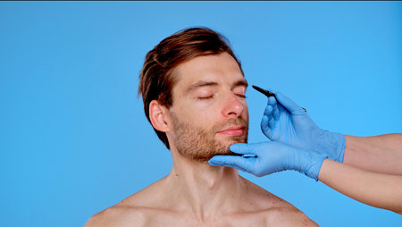 A dermatologist takes a skin scraping and tests for demodicosis and dermatitis, fungal infection. Close-up of a male patient's face at a doctor's appointment
