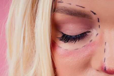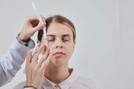 Blepharoplasty of a woman marking on her face before plastic surgery to change the eye area in a medical clinic