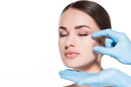 Cosmetic surgeon drawing correcting lines under women?s eyes