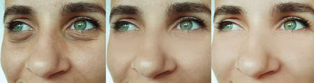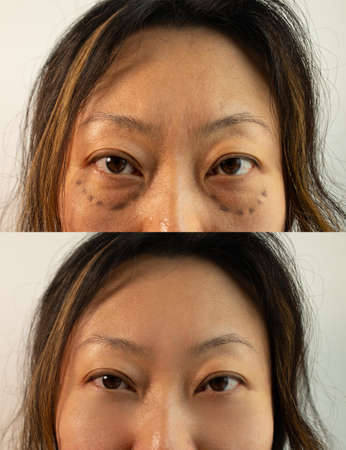 Asian Woman With Under Eye Bag. Puffy Eye Of Girl Showing Eyes Bags. Before And After Cosmetic Surgery.