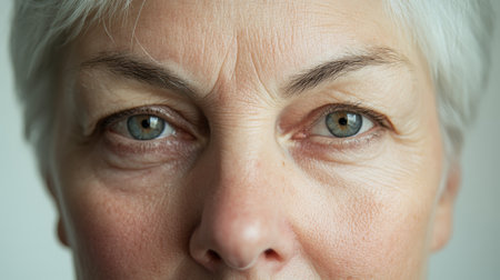 Close up of a senior womans face highlighting wrinkles, crows feet, and potential vision problems, emphasizing the effects of aging on skin and eyesight