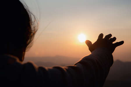 Silhouette woman on sunset background. Woman raising his hands in worship. Christian Religion concept background.