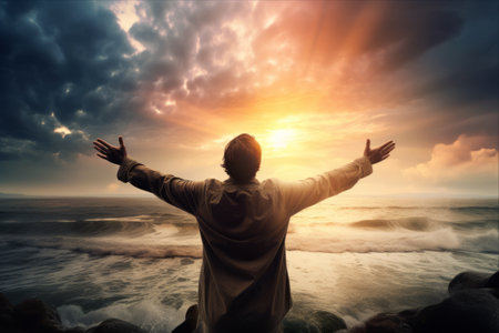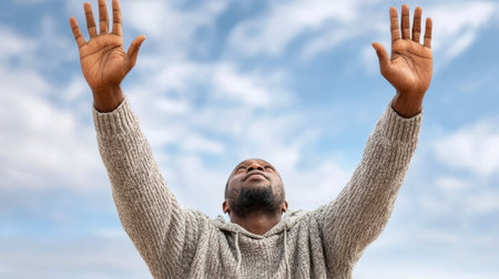 A man with hands outstretched to heaven in devotion to God Generative AI Illustration.