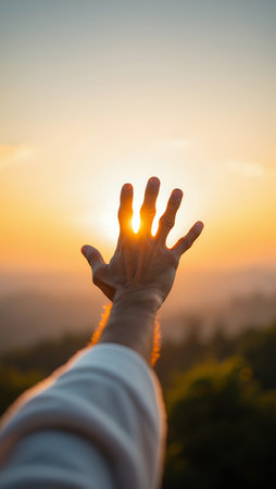 A close-up of a hand reaching out towards a stunning sunset, with warm hues illuminating the sky and distant hills, creating a serene and hopeful atmosphere in the evening light