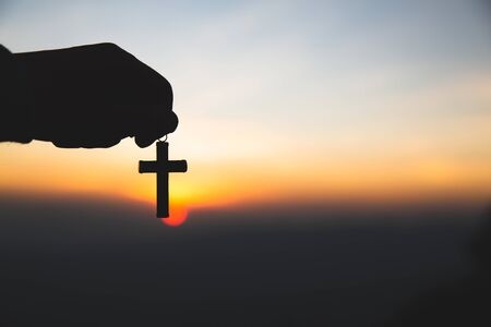 Silhouette of a man praying with a cross in hand at sunrise, religion concept.