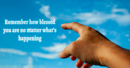 Motivational quote about remembering you blessed you are on sticky note with hand pointing to sky background. Motivational concept.