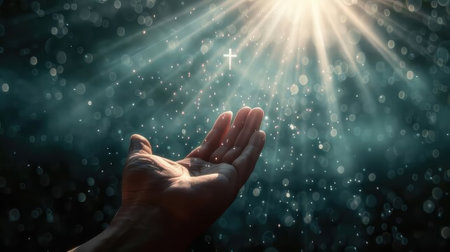 Two hands are lifted upward, bathed in soft rays of light, symbolizing a search for inspiration and hope in a tranquil environment.