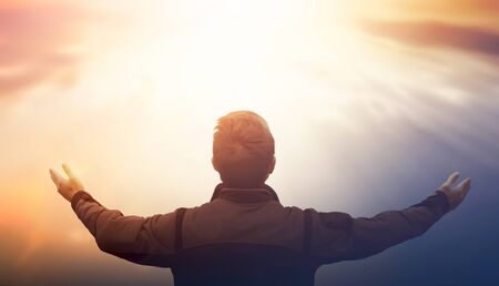 Silhouette of Man pray on during sunset. Repentance, regret and hope concept