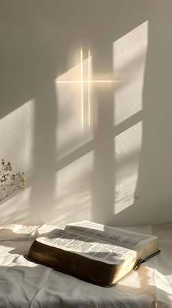 A contemplative figure stands under a glowing cross, surrounded by misty atmosphere during a dramatic lighting at dusk
