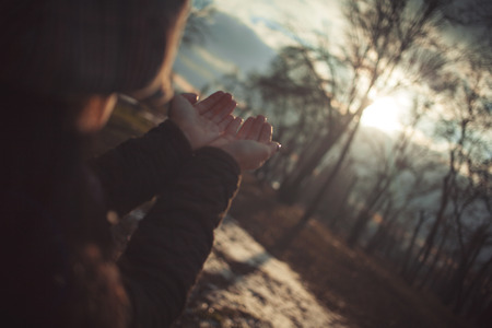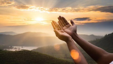 Open hands are held up towards the bright sun, with soft light illuminating them and a blurred mountainous landscape in the background.