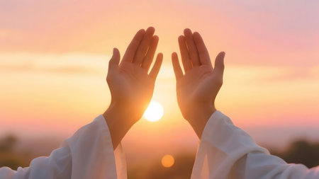 Muslim hands raised in prayer against the backdrop of a dark sky adorned with twinkling stars and a crescent moon, symbolizing the divine connection and reverence felt during moments of worship