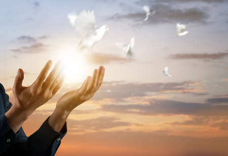 Silhouette of businessman raised hands and praying to god with flying pigeon on a sunrise sky background