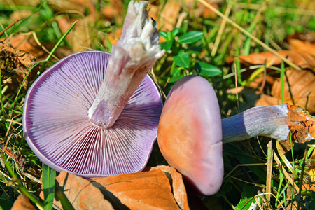 Mushrooms. Mushrooms in the forest. Closed full frame textured background of saffron hood mushroom growing in wild nature. Piece in a beautiful autumn forest. Group fungi. Autumn t