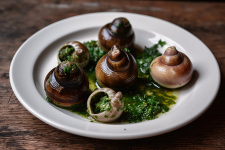 Macro image of Escargots with garlic butter and herbs, served in a white ceramic plate on a rustic wooden table, AI Generated