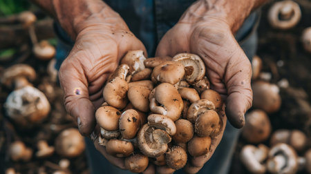 Closeup of a farmer's hands holding fresh mushrooms. Generated by artificial intelligence.