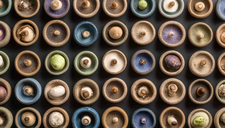 High-angle, close-up view of a grid pattern formed by various types of mushrooms placed inside small, round, colorful ceramic bowls. The bowls are arranged on a dark surface, creating a visually appealing design. The image emphasizes the variety of shapes, sizes, and colors of the mushrooms, as well as the texture of the ceramic bowls.
