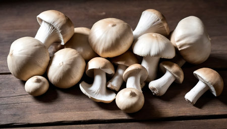 Straw mushroom and king oyster mushrooms on wooden table