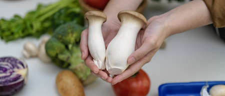 Close up view of hands holding king oyster mushrooms while standing at table with other fresh farm vegetables