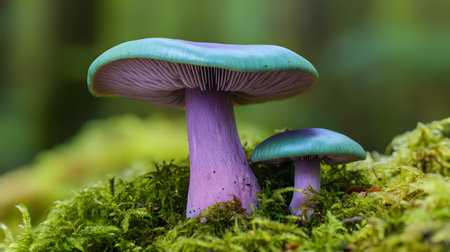 Two striking mushrooms with vibrant purple stems and green caps emerge from a mossy forest floor. The detailed gills and soft lighting create an enchanting, natural scene.