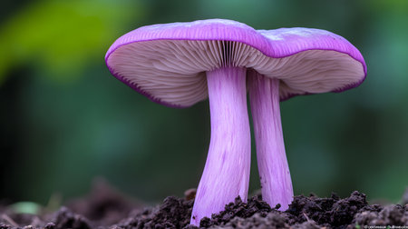 Two vibrant purple mushrooms stand tall in dark soil. Their delicate gills are illuminated, creating a mystical forest scene.