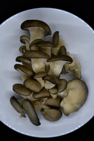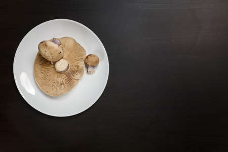 Tricholoma mushrooms on a white plate on black table. Diet, nutrition, healthy and unhealthy eating habits, overweight or underweight concept.