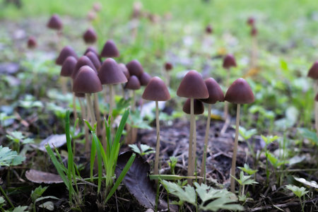 Group of Psathyrella conopilus mushrooms growing on forest soil, with a mysterious, psychedelic vibe in the natural autumn setting.