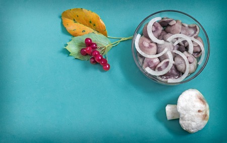 On a blue background marinated mushrooms in a vase, next to fresh mushrooms and autumn leaves.