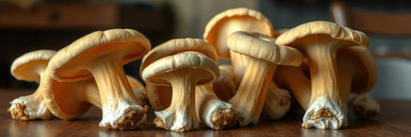 Freshly harvested yellow mushrooms displayed on a wooden surface ready for culinary use in a kitchen setting